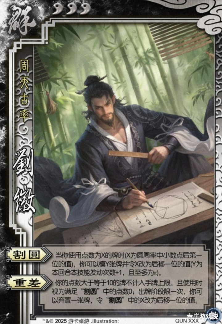 数的代表性人物是刘徽,是著名数学家,圆周率的始祖。刘徽的技能和圆周率息息相关,【割圆】是圆周率点数,【重差】是圆周率的下一位,此时卡牌点数和圆周率相同,就能摸牌,又是一位大数学家!
