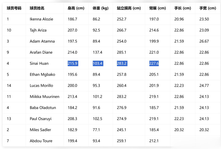 据博主花球世界社媒发文:郇斯楠在nike峰会上的体测数据,身高215.9公分、臂展227.6公分,站立摸高283.2公分。