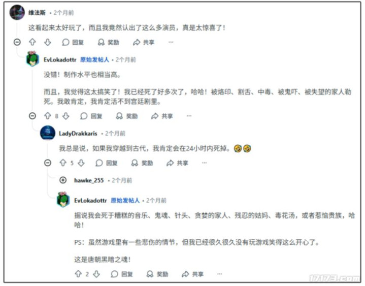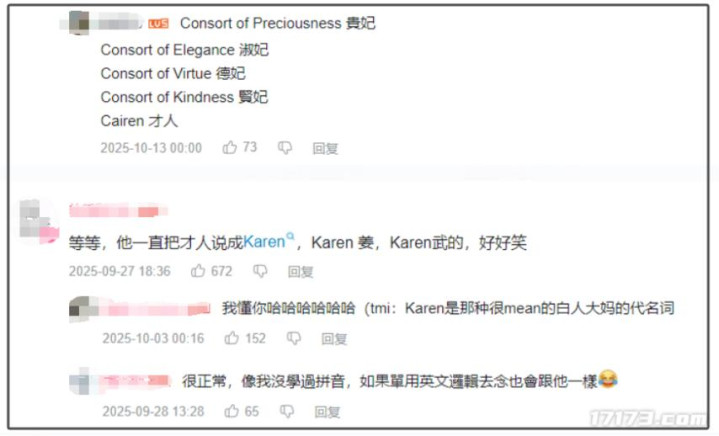 比如游戏一开始,女主只是个刚进宫的小才人——古代后宫里最低阶的妃嫔之一。才人在这《盛世天下》里出现得贼频繁,老外们却总是把「cairen」念成了「Karen」(欧美语境里爱找茬的事儿精的代名词),于是每次出现这个音,弹幕立马笑疯。