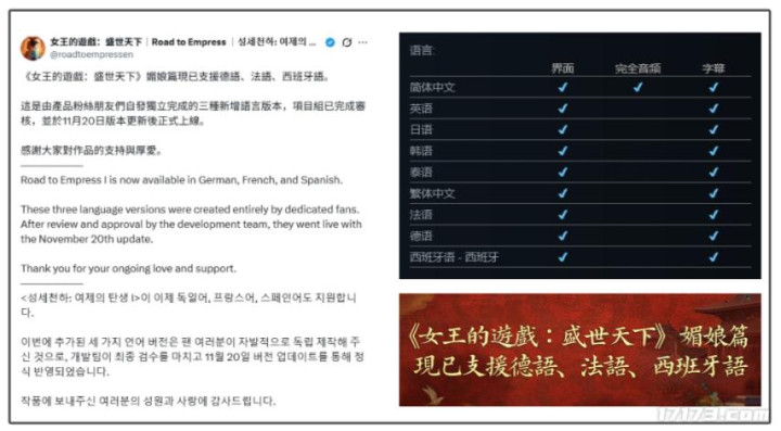 随着游戏海外传播越来越广,原本只有简繁中文、英日韩语、泰语的版本,在粉丝自发翻译助力下,新增了德、法、西三种语言,最终经官方审核发布。